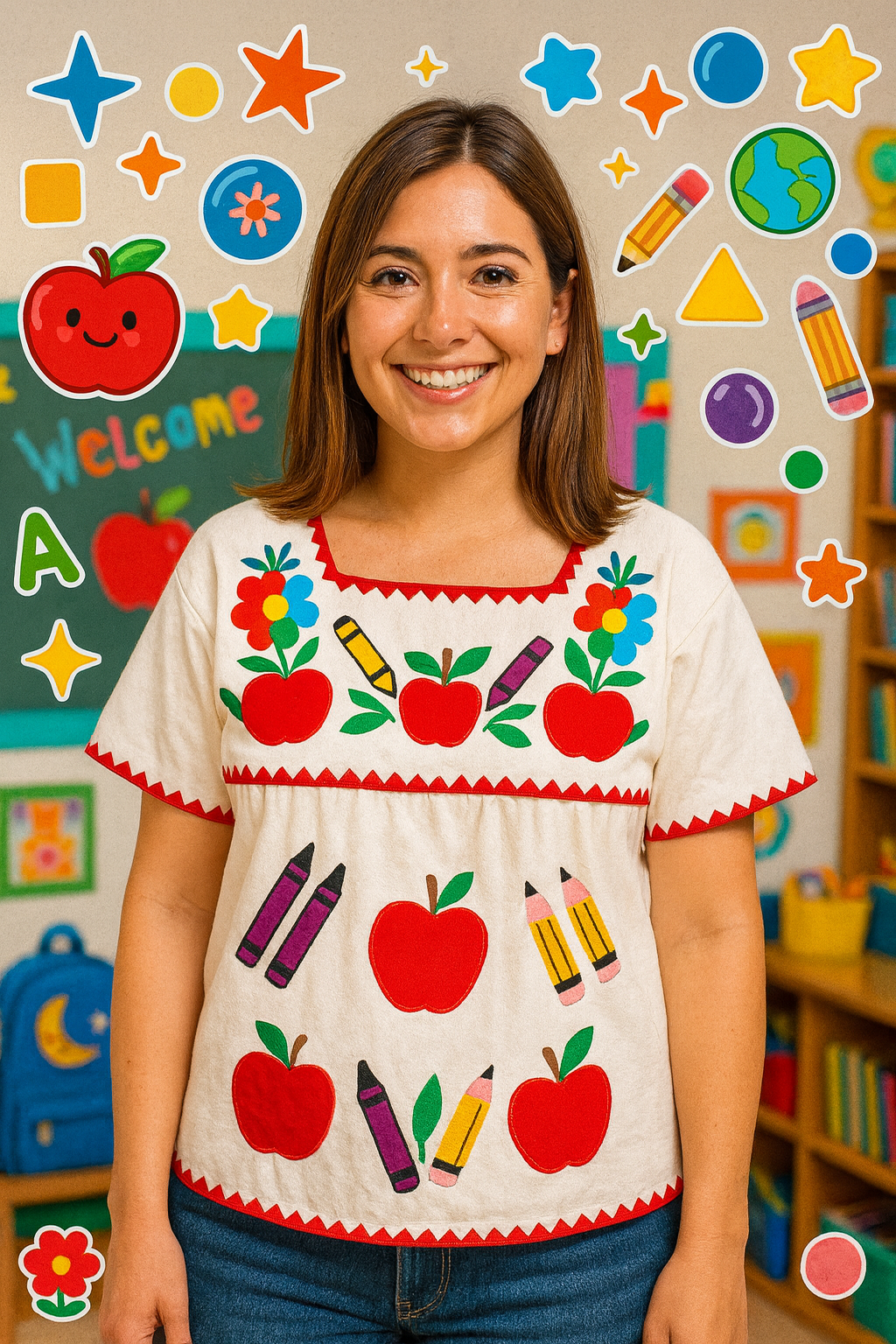 EDICIÓN LIMITADA Blusa típica mexicana de manta con bordado y aplicaciones originales de universo preescolar